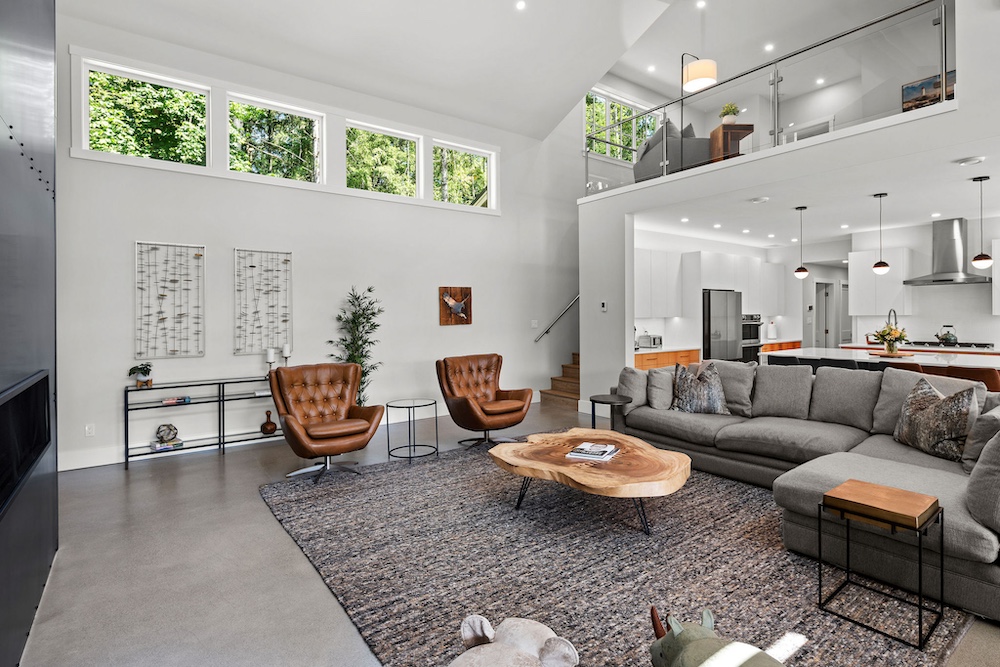 Large West-facing windows capture views of Mt. Prevost looking down on this peaceful forested estate property. The windows let in plenty of natural light, as well as add to the architectural appeal of the home’s exterior. The loft area on the upper floor looks down on the living room below. It utilizes glass railings, which adds to the open feel of the home.
