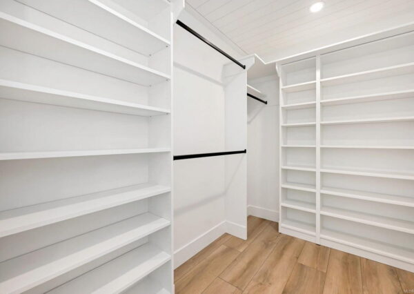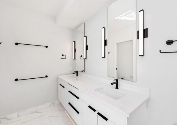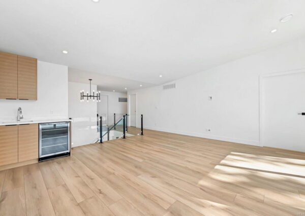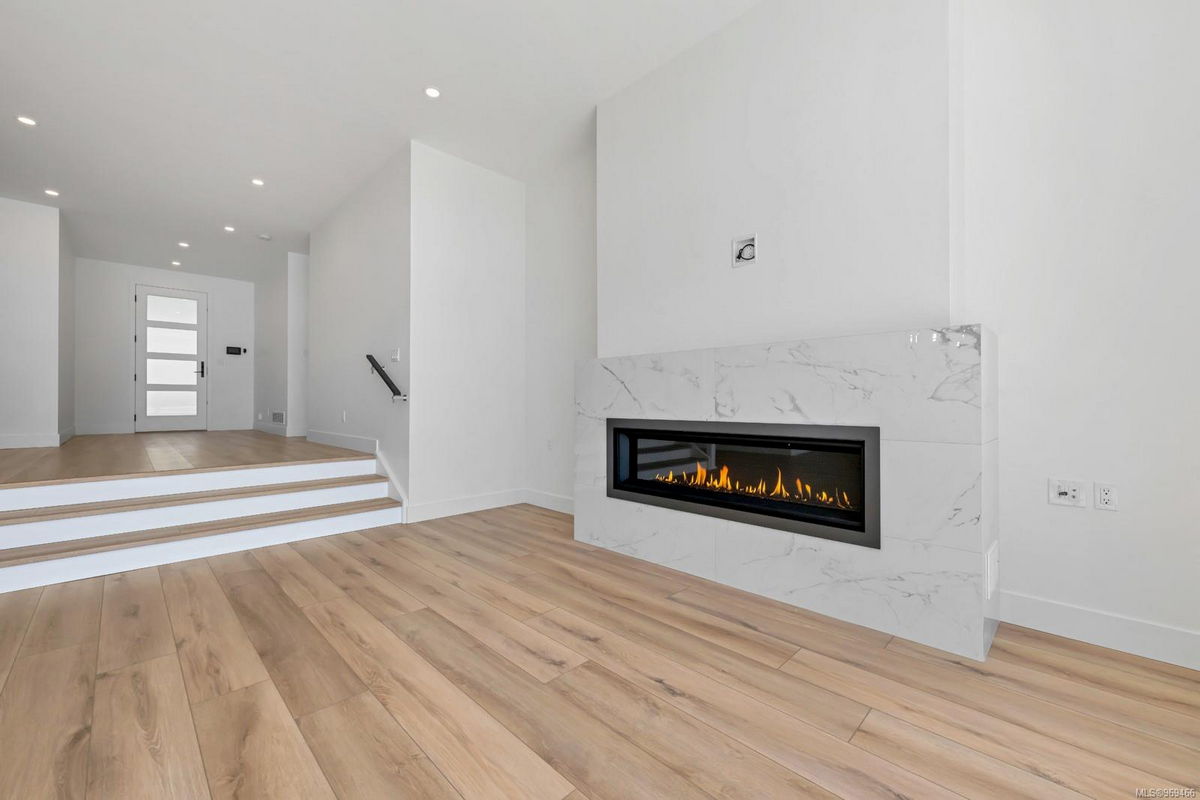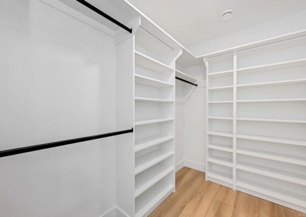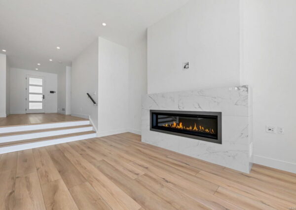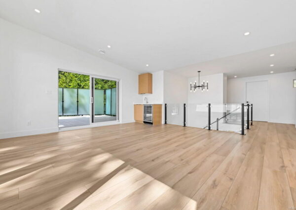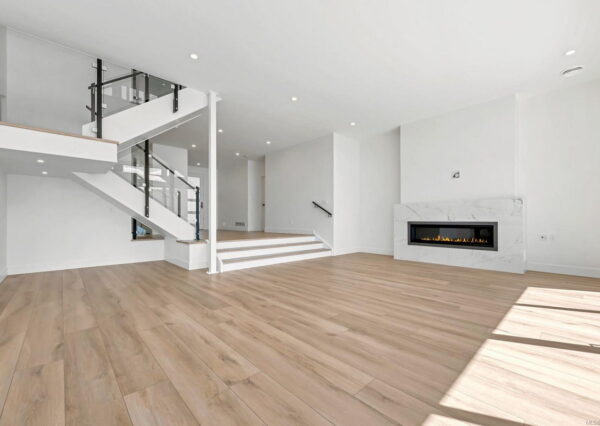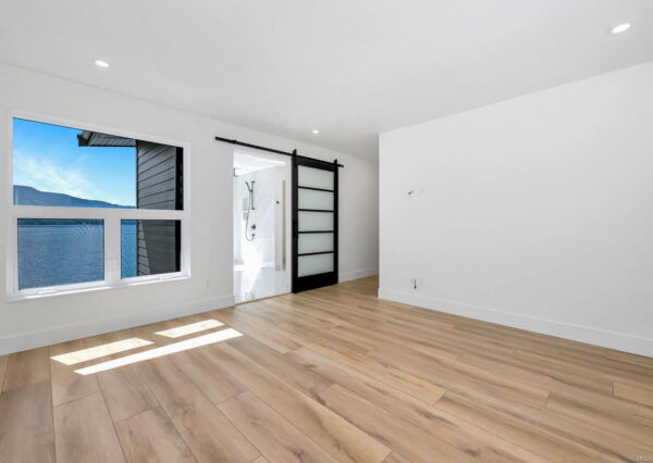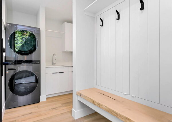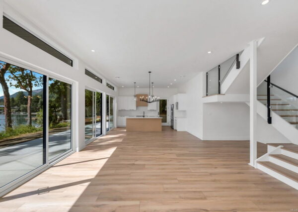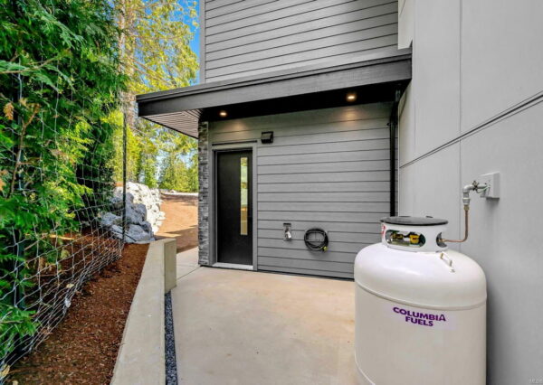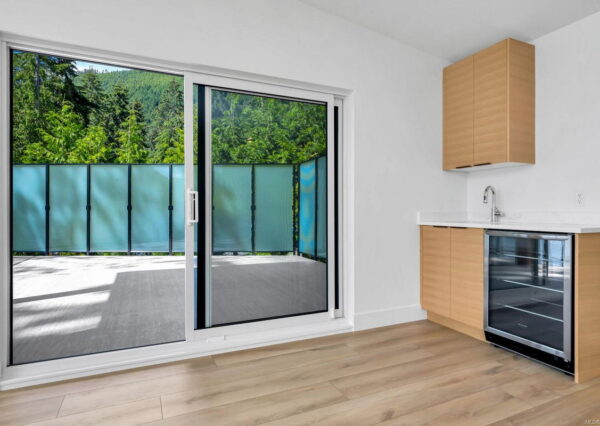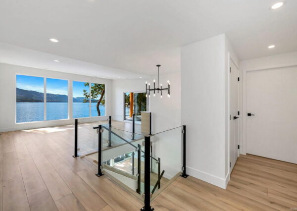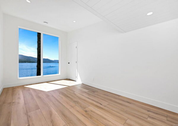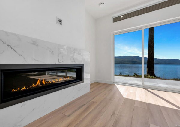 Step inside to discover the sleek, open concept interior, flooded with natural light and high-end finishes, wide plank flooring, as well as recessed lighting inside and out. On the main level, the in-line living, dining and kitchen are highlighted by 11’ ceilings, and floor-to-ceiling patio doors and windows frame the incredible view. A large, linear gas fireplace highlights the living room. The kitchen features quartz countertops and backsplashes, Fisher & Paykel SS appliances, and an island for casual dining. The home gym’s French doors open onto a private patio. The laundry/mud room features a live-edge bench.