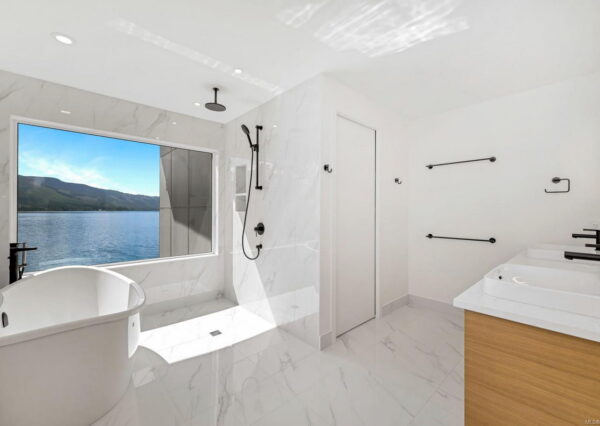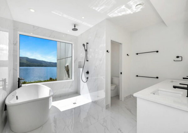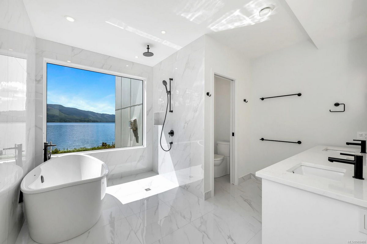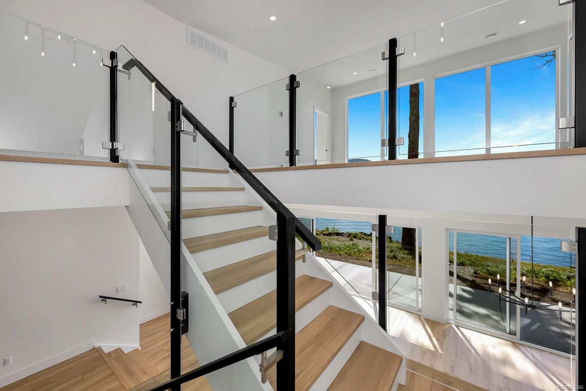 This beautiful home on the water boasts a luxurious primary suite and a second bedroom on each floor, which accommodates multi-generational or aging-in-place living. Their spa-like en-suites have in-floor heating, double sinks and elegant wet rooms with amazing views! The upper floor features a home office and a media room that opens onto a spacious deck with privacy glass and more views!